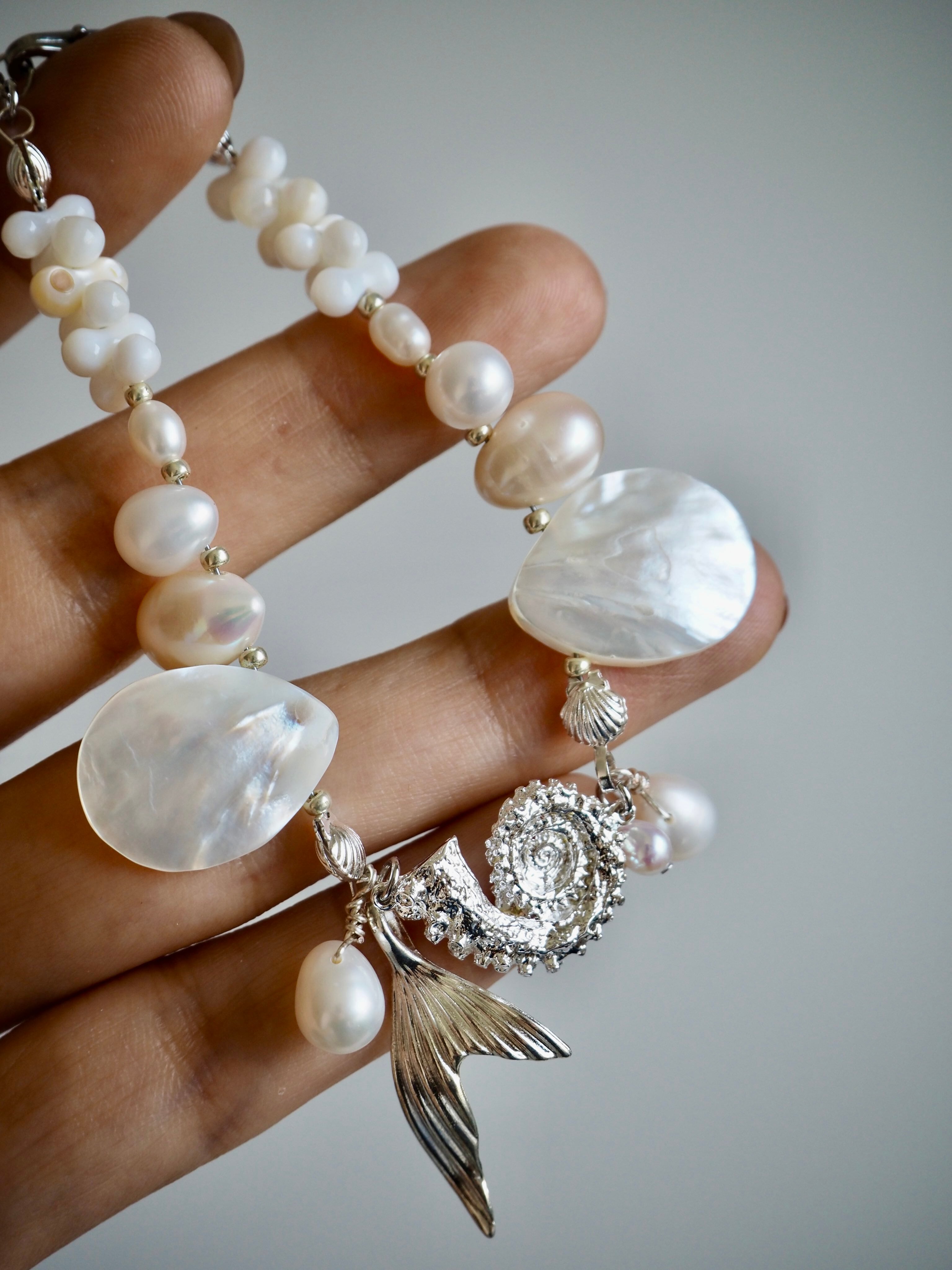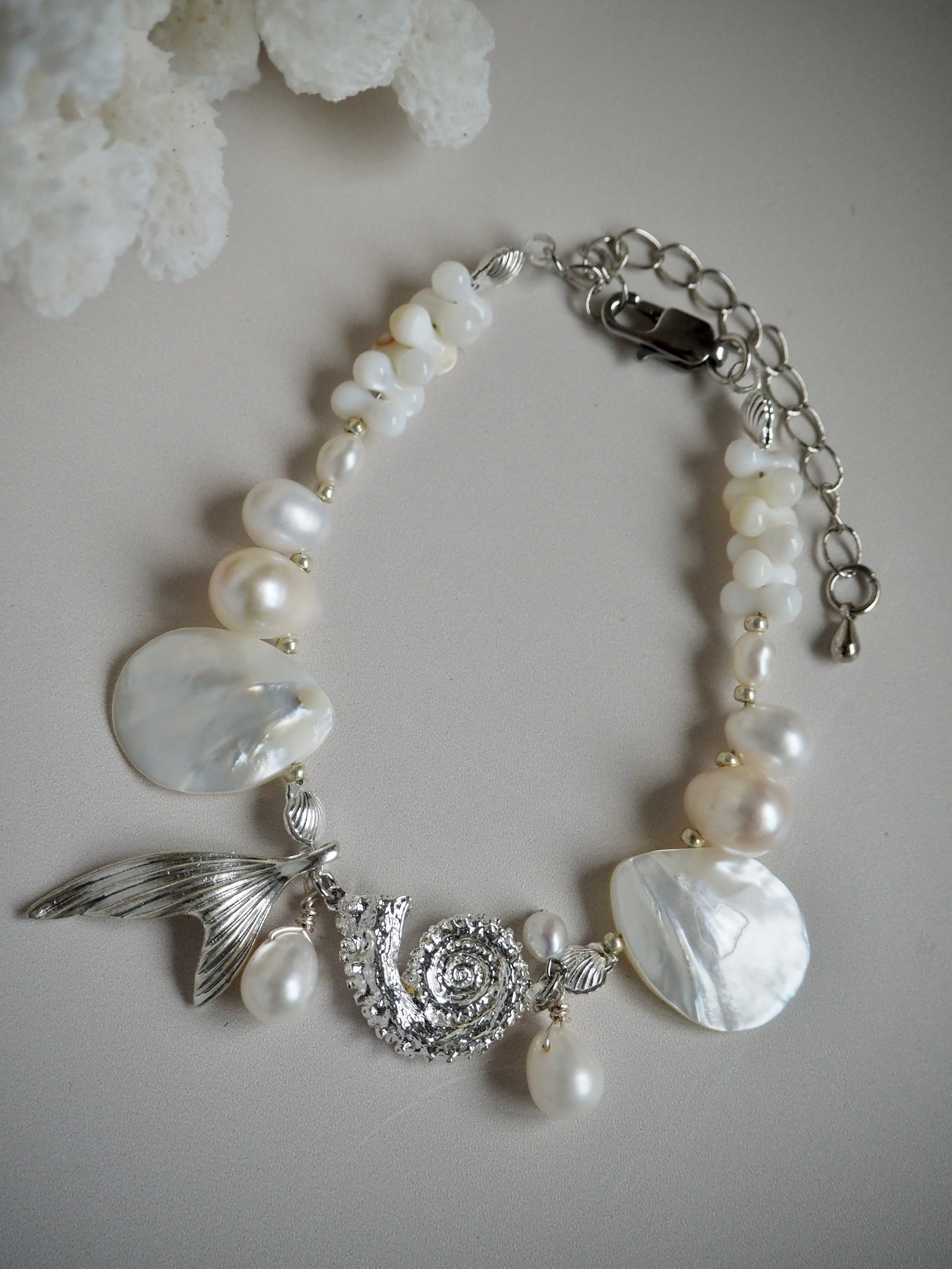 海の泡とタコのブレスレット(淡水パール、タカセガイ)