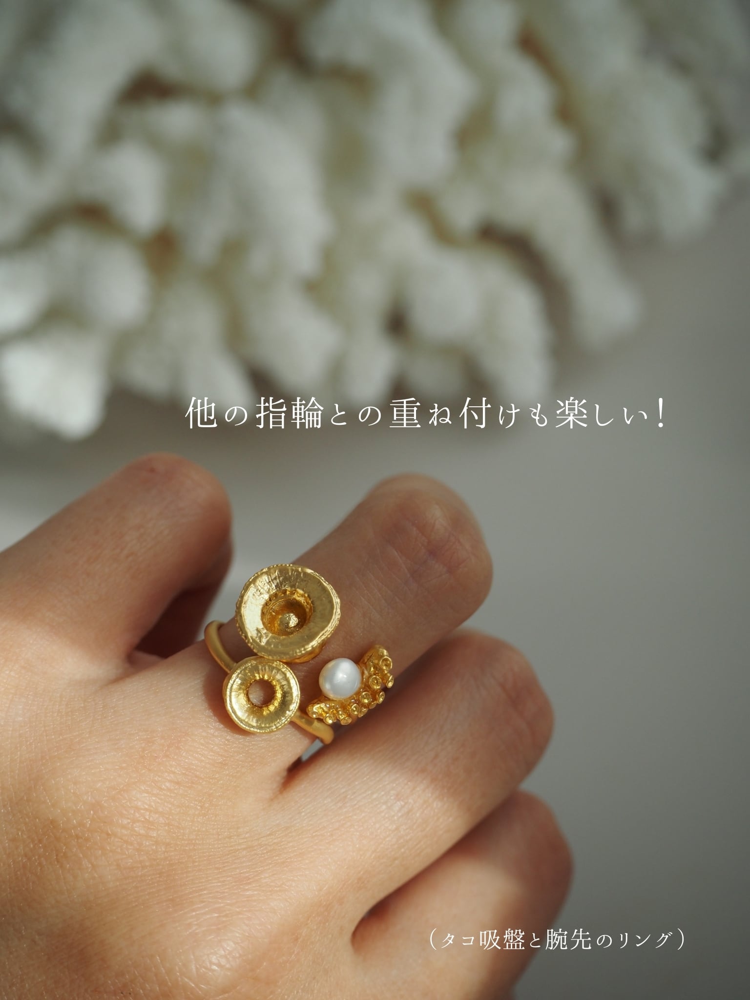 本物のタコ吸盤を型取りしたフリーサイズのリング。重ね付けするほど指がタコになっちゃう!ひとつだけ着けると意外とタコって分からないかもな日常に“擬態”するデザインです。
