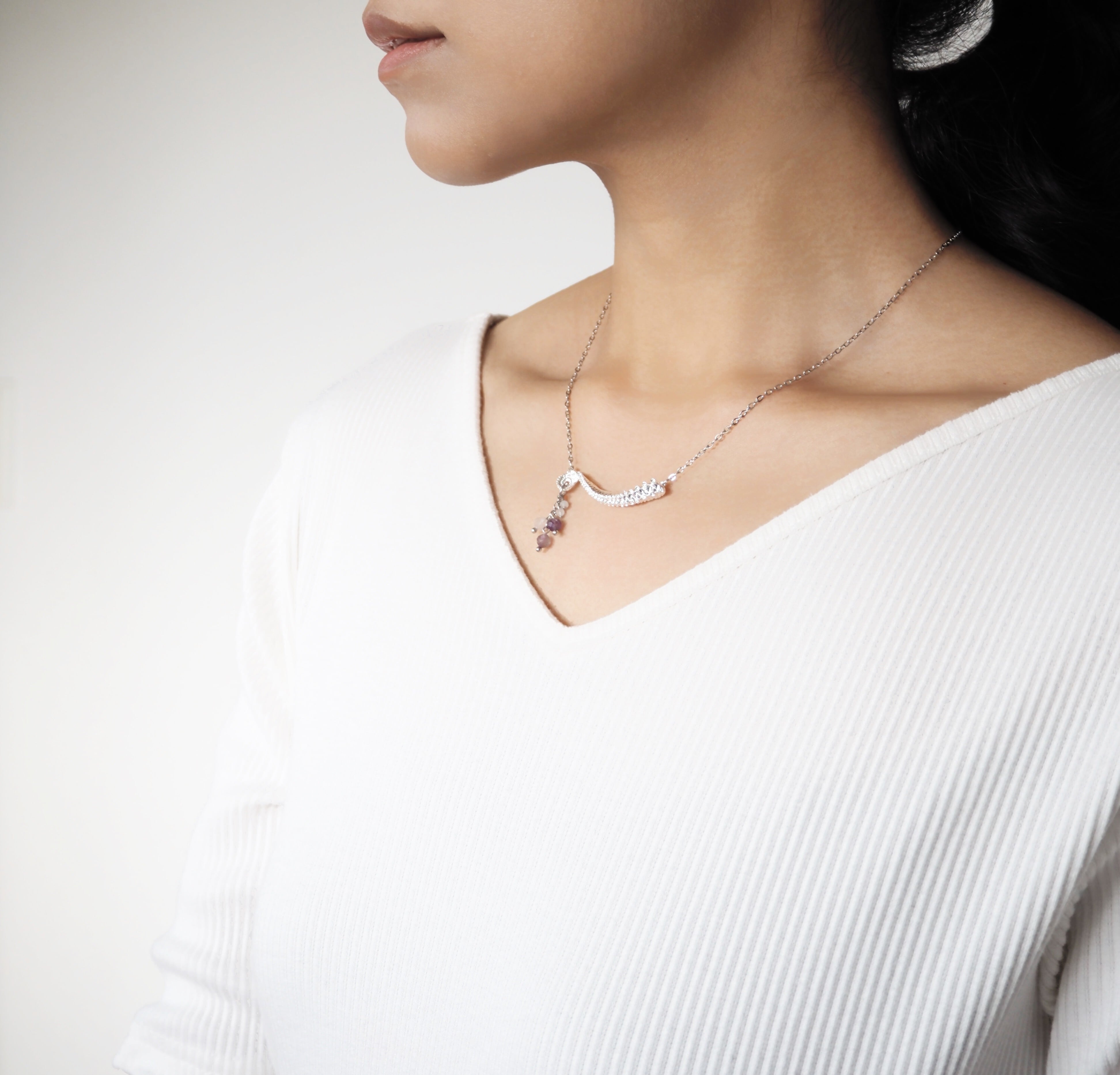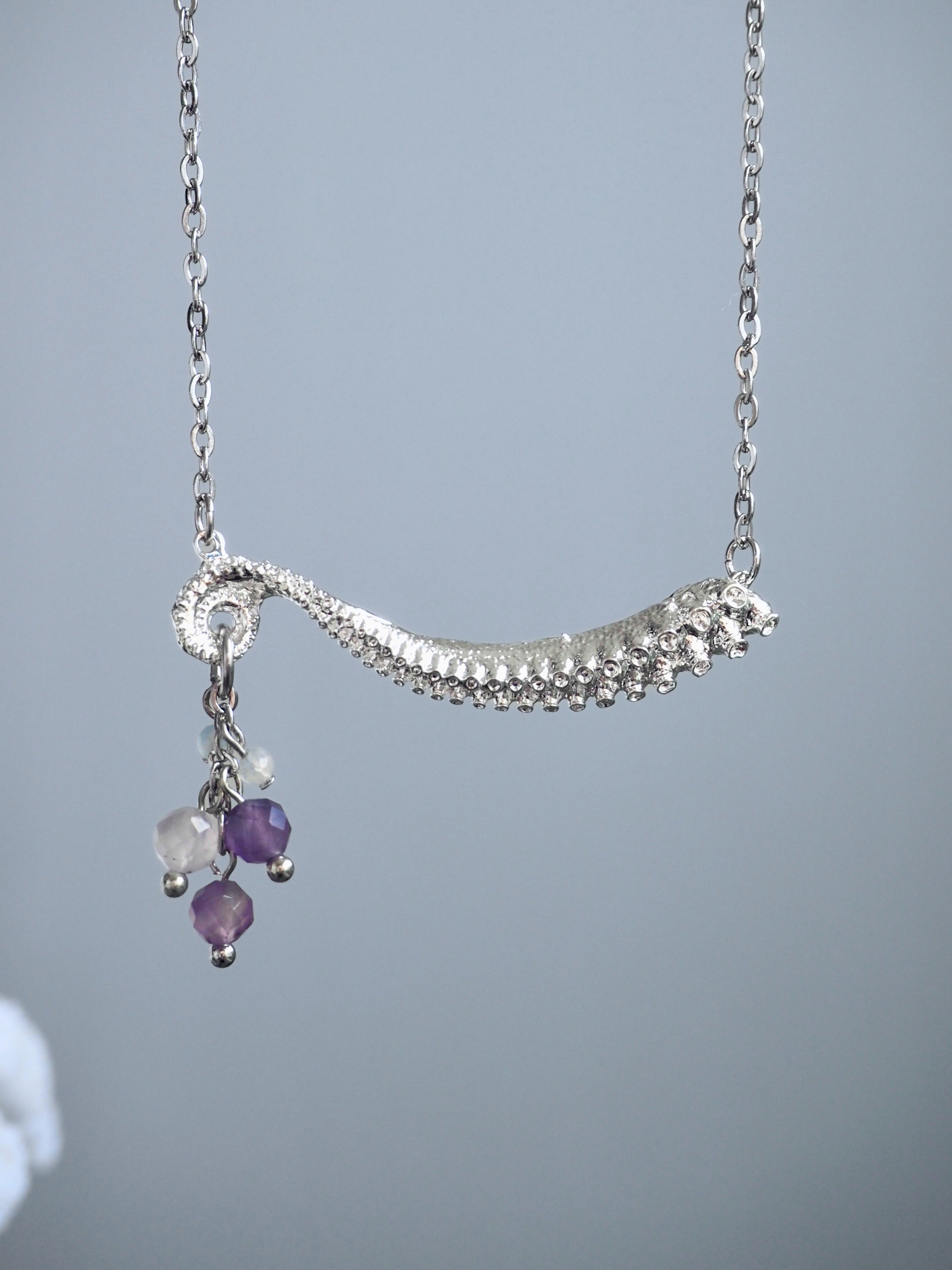 本物を型取りしたタコ腕に「真実の愛」アメジスト、「海の水」を意味するアクアマリンを組み合わせて慈悲深い愛情と儚い海の泡を表現しました。