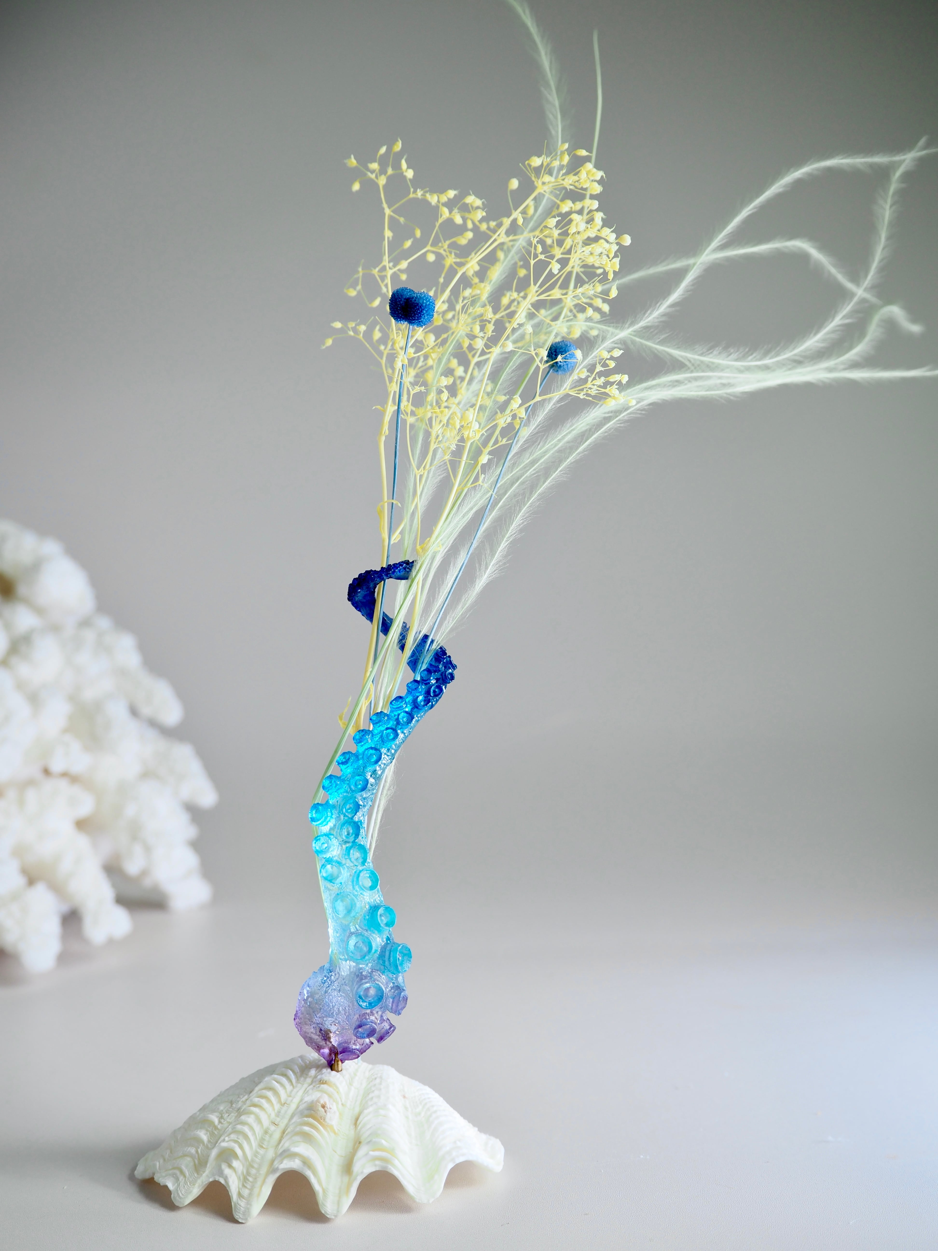 タコがくるんとお花に巻き付く一輪挿し。本物のタコを型取りして制作しました。