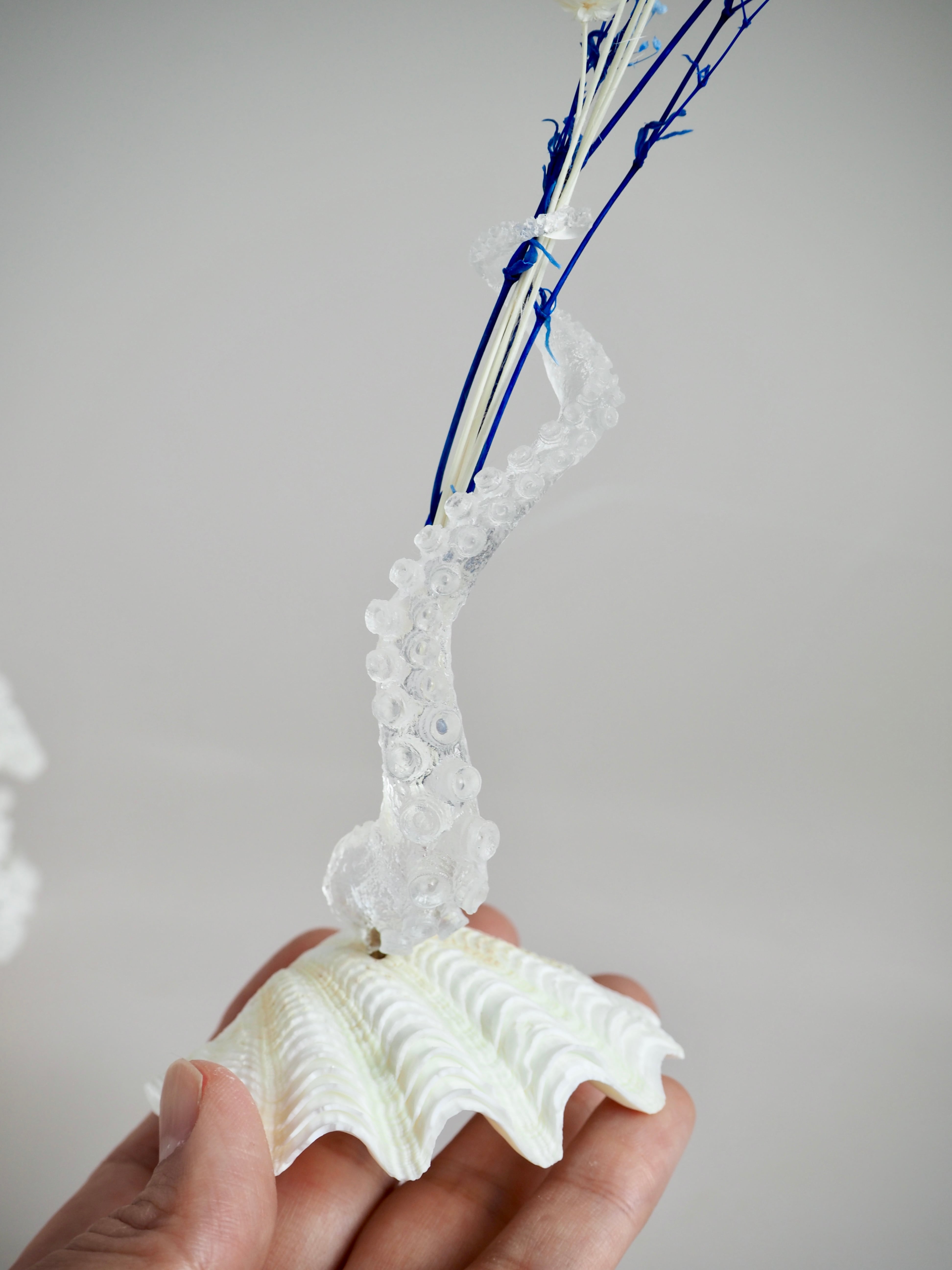 タコがくるんとお花に巻き付く一輪挿し。本物のタコを型取りして制作しました。